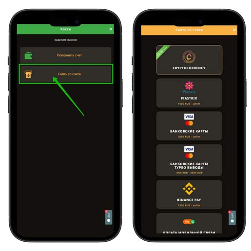 Для пополнения счета доступны банковские карты (Visa, Mastercard, Мир), электронные кошельки (Piastrix, ЮMoney, WebMoney), а также криптовалюты. Минимальный депозит — 500 рублей. Все операции обрабатываются мгновенно, лимиты и комиссии указаны в разделе «Платежи».